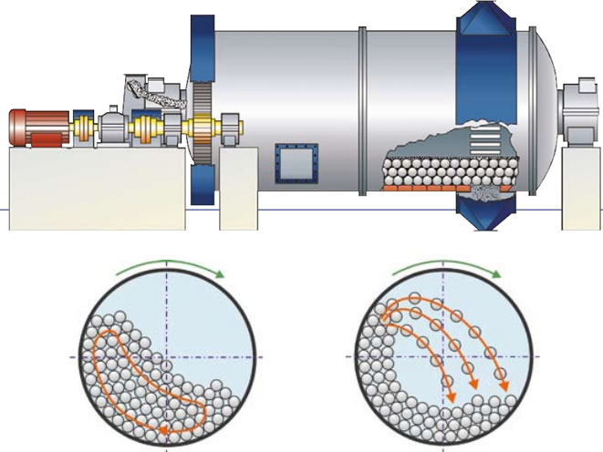 球磨機工作時,物料由進料端空心軸裝入筒體內(nèi),當球磨機筒體轉動時候,研磨體由于慣性、離心力和摩擦力作用,使它附在筒體襯板上被筒體帶走,當被帶到一定的高度時候,由于其本身的重力作用而被拋落,下落的研磨體像拋射體一樣將筒體內(nèi)的物料給擊碎。物料由進料裝置經(jīng)入料中空軸螺旋均勻地進入球磨機第一倉,該倉內(nèi)有階梯襯板或波紋襯板,內(nèi)裝不同規(guī)格鋼球,筒體轉動產(chǎn)生離心力將鋼球帶到一定高度后落下,對物料產(chǎn)生重擊和研磨作用。物料在第一倉達到粗磨后,經(jīng)單層隔倉板進入第二倉,該倉內(nèi)鑲有平襯板,內(nèi)有鋼球,將物料進一步研磨。粉狀物通過卸料箅板排出,完成粉磨作業(yè)。