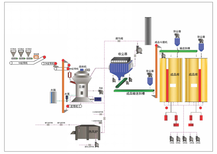 堆放著的礦渣由鏟車取料、喂料,通過皮帶機進行輸送。在輸送過程中,礦渣原料先后經(jīng)由除鐵器和振動篩得到除鐵和篩分,然后通過稱重設(shè)備倉、提升機進入礦渣立磨機進行粉磨。粉磨后的礦渣借助熱風(fēng)爐提供的熱風(fēng),通過選粉機進行選粉,同時得到烘干。符合細度要求的礦渣粉較后被輸送到收塵器收集、盛放后,由空氣輸送斜槽、提升機進入成品庫中儲存。